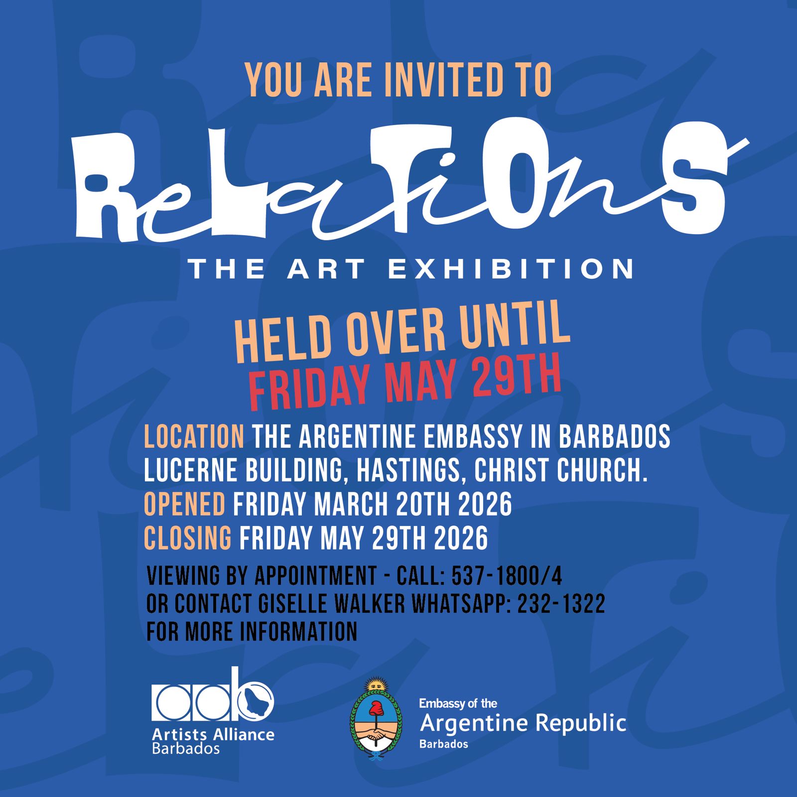 « All Events Relations- The Art Exhibition March 20 @ 6:00 pm - May 29 @ 5:00 pm « Reimagined II: Under the Galvanize Roof – Opening Reception Reimagined II: Under the Galvanize Roof- Meet the Artists » Add to calendar Google Calendar iCalendar Outlook 365 Outlook Live Details Start: March 20 @ 6:00 pm End: May 29 @ 5:00 pm Event Category: Exhibition Venue The Embassy of Argentina The Embassy of Argentina, Lucerne Building, Christ Church Bridgetown, Barbados + Google Map